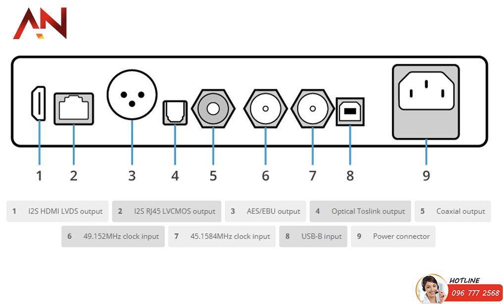 | Outputs | 1x Coaxial 1x Optical Toslink 1x AES/EBU 1x I2S HDMI LVDS 1x I2S RJ45 LVCMOS |